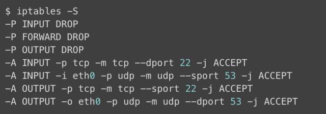 前三个规则显示,默认情况下流量已被丢弃。剩下的规则表示允许 SSH 和 DNS 流量。在这种情况下,如果需要允许流量到外部端点的规则,请跟上 sysadmin。如果这是用于本地开发或测试的主机,可使用 iptables 命令来允许合适的流量。添加允许到主机的流量的规则时一定要谨慎。