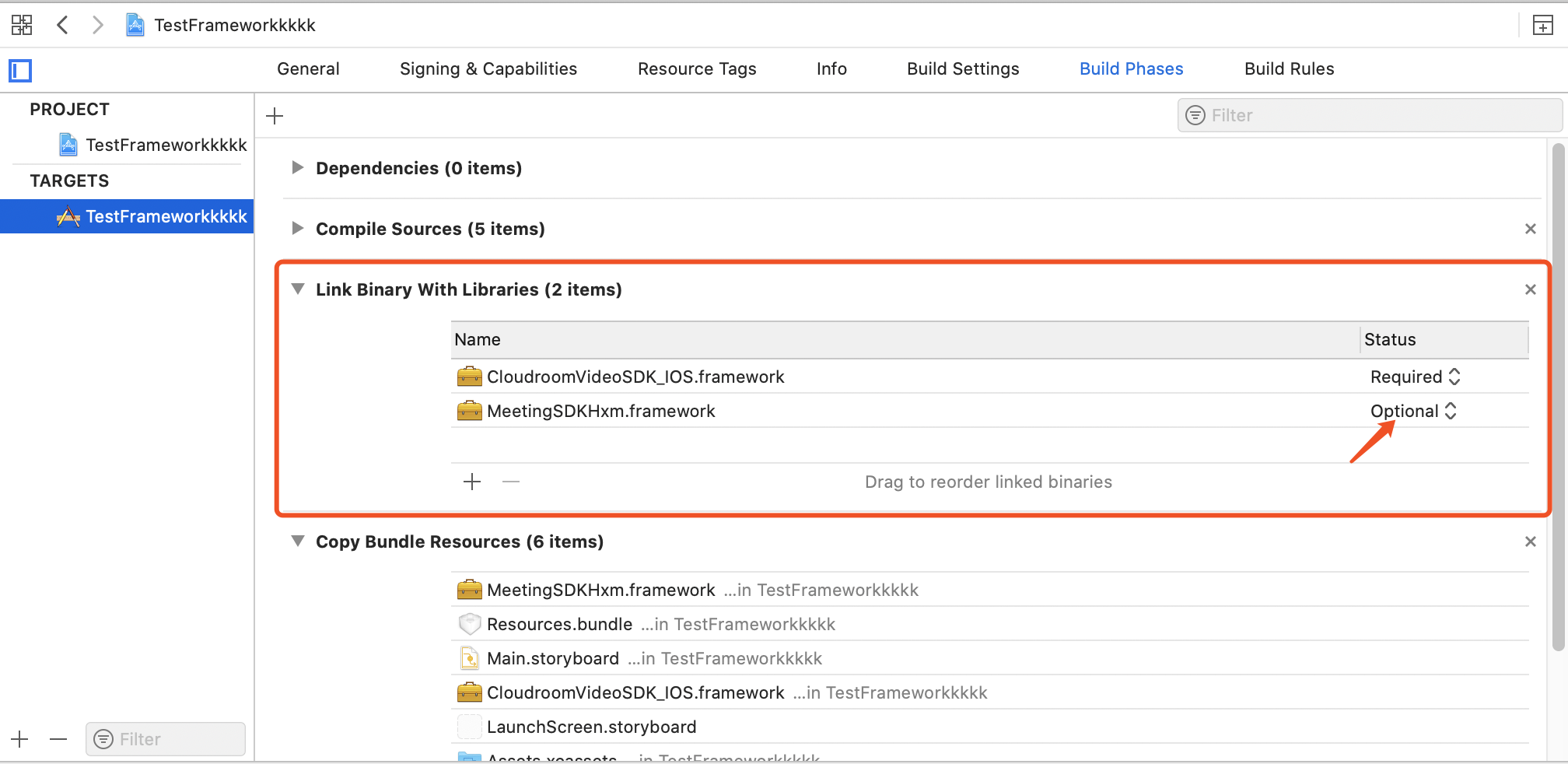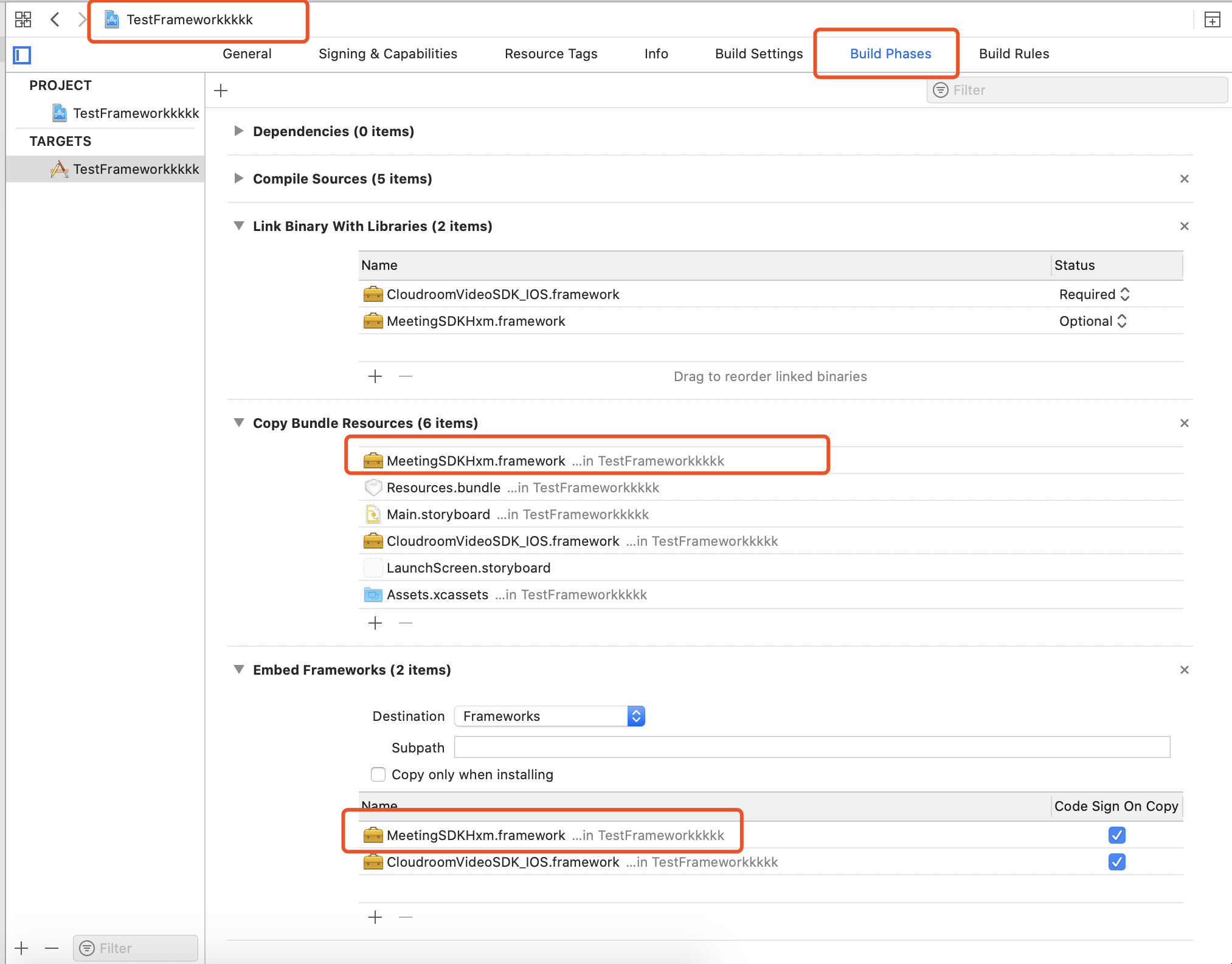 Project -> Build Phases -> Copy Bundle Resources 和 Embed Frameworks都加入MeetingSDKHxm就OK了。如图: