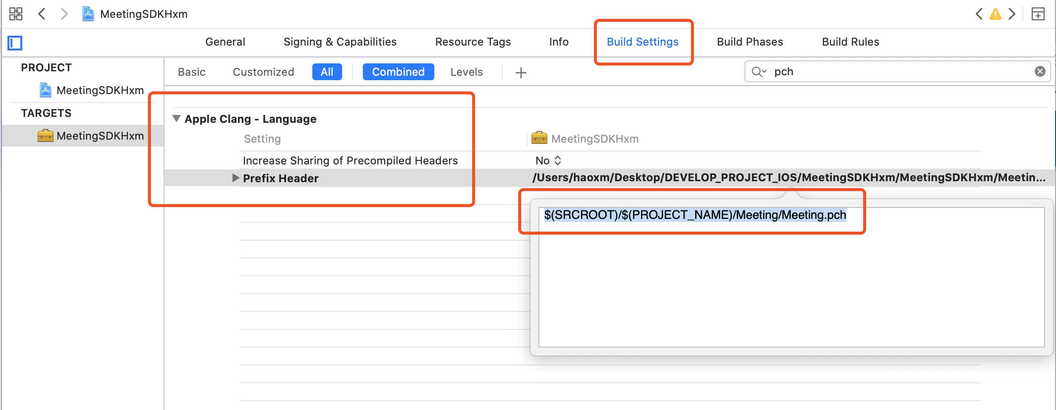 1、先创建一个空的framework叫MeetingSDKHxm,把云屋sdk整个项目都拽进去,编译各种报错,都是一些基础库没有引入,不应该呀,看了下都在pch文件中引入的,那就是pch文件路径找的不对,改成: