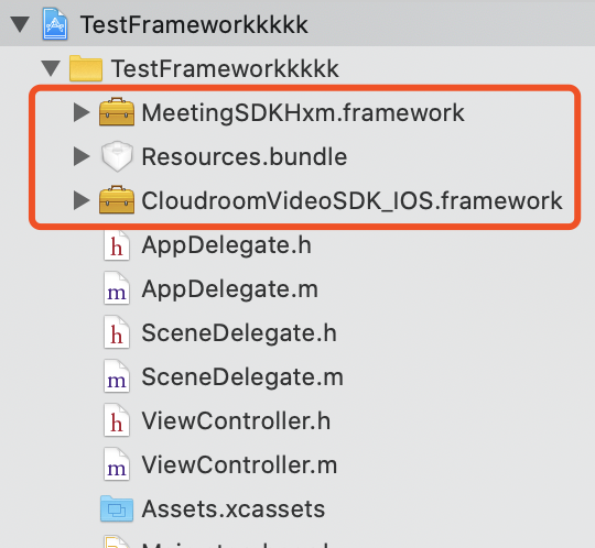 4、注意:网上的教程都是在MeetingSDKHxm.framework内新建bundle文件,把图片和storyboard拖拽进去,可我在TestFrameworkKKK中用上述代码测试根本调用不到storyboard