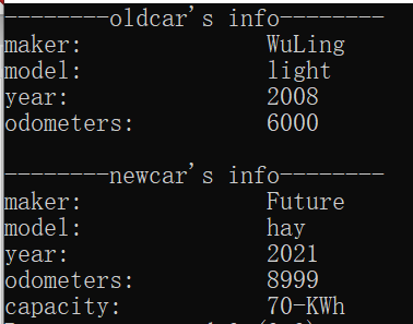 #include <iostream> #include"Car.hpp" #include"Battery.hpp" #include"ElectricCar.hpp" using namespace std; int main() { using namespace std; // test class of Car Car oldcar("WuLing", "light", 2008); cout << "--------oldcar's info--------" << endl; oldcar.update_odometers(6000); oldcar.info(); cout << endl; // test class of ElectricCar ElectricCar newcar("Future", "hay", 2021); newcar.update_odometers(8999); cout << "\n--------newcar's info--------\n"; newcar.info(); }