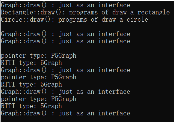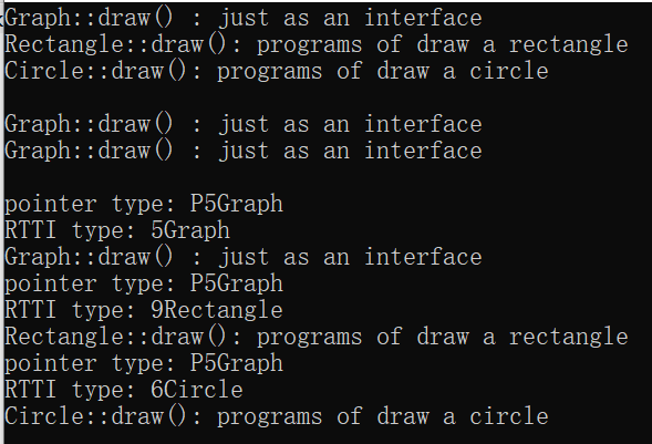 #include <iostream> #include <typeinfo> // definitation of Graph class Graph { public: void draw() { std::cout << "Graph::draw() : just as an interface\n"; } }; // definition of Rectangle, derived from Graph class Rectangle : public Graph { public: void draw() { std::cout << "Rectangle::draw(): programs of draw a rectangle\n"; } }; // definition of Circle, derived from Graph class Circle : public Graph { public: void draw() { std::cout << "Circle::draw(): programs of draw a circle\n"; } }; // definitaion of fun(): as a call interface void fun(Graph *ptr) { std::cout << "pointer type: " << typeid(ptr).name() << "\n"; std::cout << "RTTI type: " << typeid(*ptr).name() << "\n"; ptr -> draw(); } // test int main() { Graph g1; Rectangle r1; Circle c1; // call by object name g1.draw(); r1.draw(); c1.draw(); std::cout << "\n"; // call by object name, and using the scope resolution operator:: r1.Graph::draw(); c1.Graph::draw(); std::cout << "\n"; // call by pointer to Base class fun(&g1); fun(&r1); fun(&c1); }