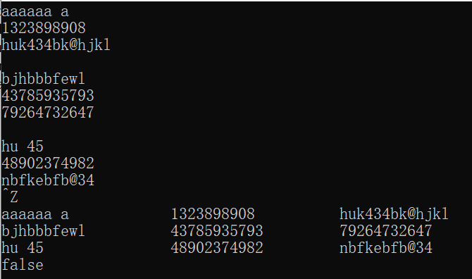 #include <iostream> #include <fstream> #include <vector> #include "Person.hpp" int main() { using namespace std; vector<Person> phone_book; Person p; while(cin>>p) phone_book.push_back(p); for(auto &i: phone_book) cout << i << endl; cout << boolalpha << (phone_book.at(0) == phone_book.at(1)) << endl; ofstream fout; fout.open("phone_book.txt"); if(!fout.is_open()) { cerr << "fail to open file phone_book.txt\n"; return 1; } for(auto &i: phone_book) fout << i << endl; fout.close(); }