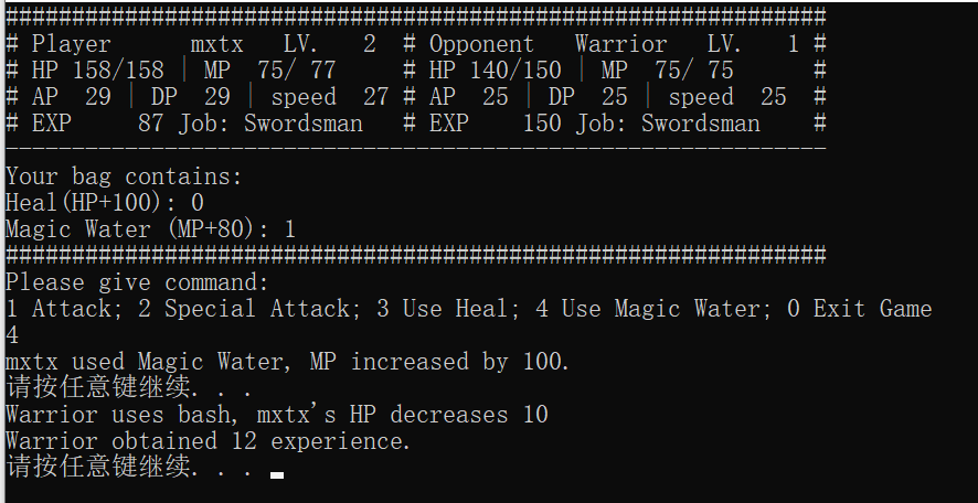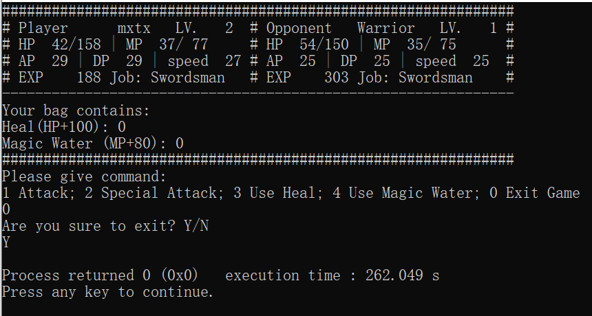 //======================= // main.cpp //======================= // main function for the RPG style game #include <iostream> #include <string> using namespace std; #include "swordsman.h" int main() { string tempName; bool success=0; //flag for storing whether operation is successful cout <<"Please input player's name: "; cin >>tempName; // get player's name from keyboard input player *human; // use pointer of base class, convenience for polymorphism int tempJob; // temp choice for job selection do { cout <<"Please choose a job: 1 Swordsman, 2 Archer, 3 Mage"<<endl; cin>>tempJob; system("cls"); // clear the screen switch(tempJob) { case 1: human=new swordsman(1,tempName); // create the character with user inputted name and job success=1; // operation succeed break; default: break; // In this case, success=0, character creation failed } }while(success!=1); // so the loop will ask user to re-create a character int tempCom; // temp command inputted by user int nOpp=0; // the Nth opponent for(int i=1;nOpp<5;i+=2) // i is opponent's level { nOpp++; system("cls"); cout<<"STAGE" <<nOpp<<endl; cout<<"Your opponent, a Level "<<i<<" Swordsman."<<endl; system("pause"); swordsman enemy(i, "Warrior"); // Initialise an opponent, level i, name "Junior" human->reFill(); // get HP/MP refill before start fight while(!human->death() && !enemy.death()) // no died { success=0; while (success!=1) { showinfo(*human,enemy); // show fighter's information cout<<"Please give command: "<<endl; cout<<"1 Attack; 2 Special Attack; 3 Use Heal; 4 Use Magic Water; 0 Exit Game"<<endl; cin>>tempCom; switch(tempCom) { case 0: cout<<"Are you sure to exit? Y/N"<<endl; char temp; cin>>temp; if(temp=='Y'||temp=='y') return 0; else break; case 1: success=human->attack(enemy); human->isLevelUp(); enemy.isDead(); break; case 2: success=human->specialatt(enemy); human->isLevelUp(); enemy.isDead(); break; case 3: success=human->useHeal(); break; case 4: success=human->useMW(); break; default: break; } } if(!enemy.death()) // If AI still alive enemy.AI(*human); else // AI died { cout<<"YOU WIN"<<endl; human->transfer(enemy); // player got all AI's items } if (human->death()) { system("cls"); cout<<endl<<setw(50)<<"GAME OVER"<<endl; exit(0); // player is dead, program is getting to its end, what should we do here? system("pause"); return 0; } } } human->isLevelUp(); // You win, program is getting to its end, what should we do here? system("cls"); cout<<"Congratulations! You defeated all opponents!!"<<endl; system("pause"); return 0; }
