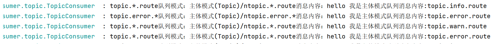 log.error("topic.*.route队列模式:"+rabbitMqMessage.getType()+"/n"+"topic.*.route消息内容:"+rabbitMqMessage.getContent());