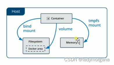 - tmpfs:挂载存储在宿主机系统的内存中,而不会写入宿主机的文件系统