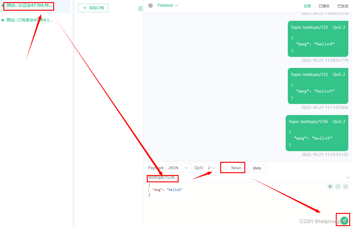 模拟两个客户端,客户端A 订阅消息,客户端B 发送消息,测试如下功能