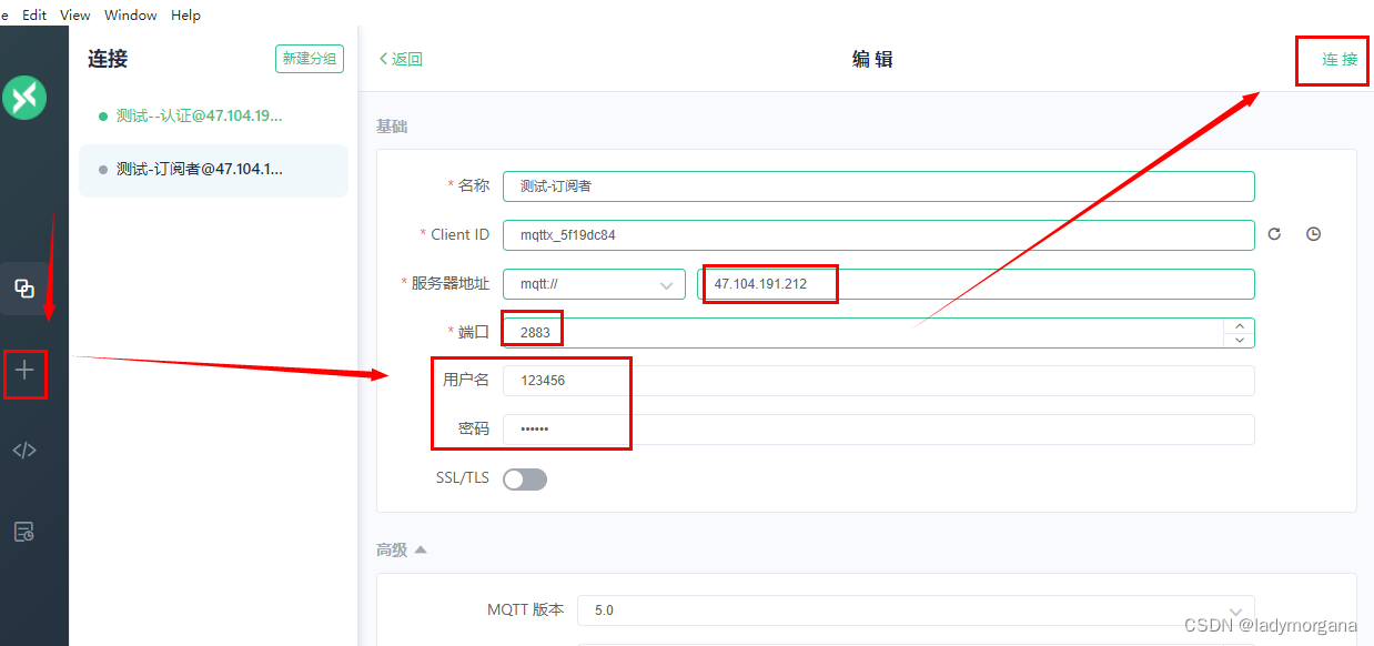 依次创建两个客户端 (上一章MQTT服务器设置了用户名密码认证)