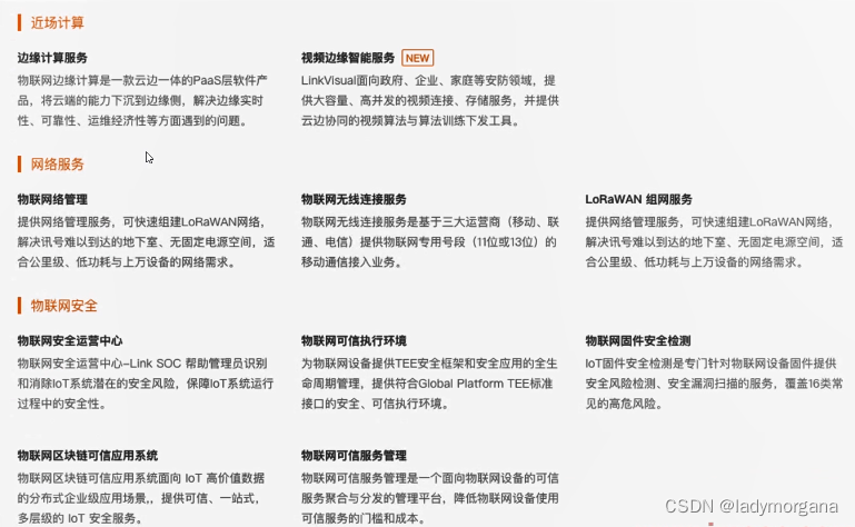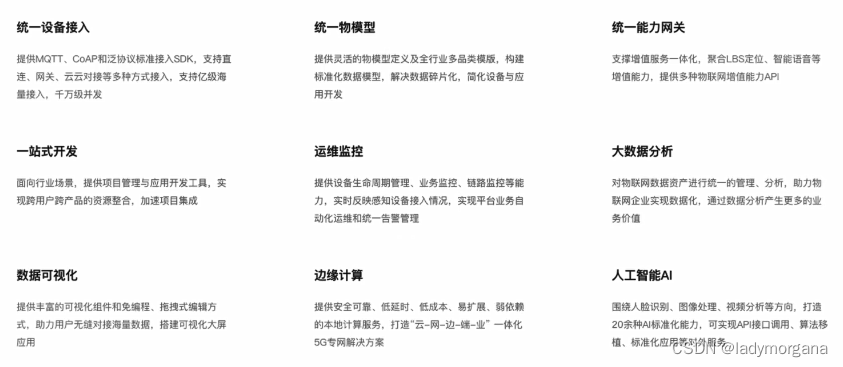 - 主要功能都包含设备接入,设备与配置,安全,OTA等