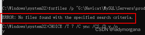 C:\Windows\system32>forfiles /p "G:/Navicat/MySQL/Servers/learn-47.116.6.228/xph" /m *.nb3 /d -7 /c "cmd /c del @path"