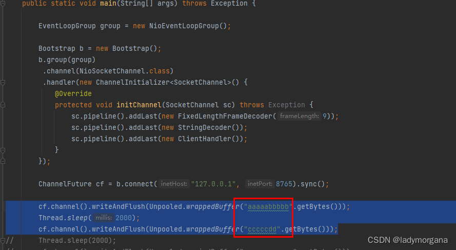 - 客户端发送数据方法cf.channel().writeAndFlush(Unpooled.wrappedBuffer("abc".getBytes()))