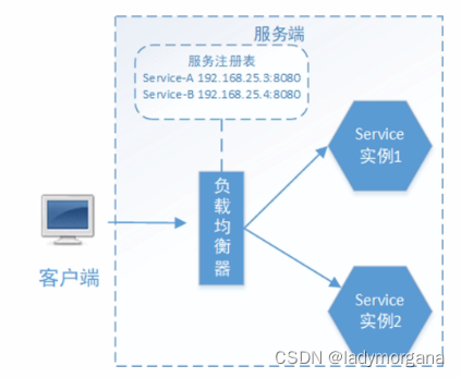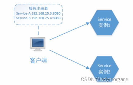 (客户端==Sercive A,在Sercive A上选择好了生产者地址,所以叫客户端负载均衡)