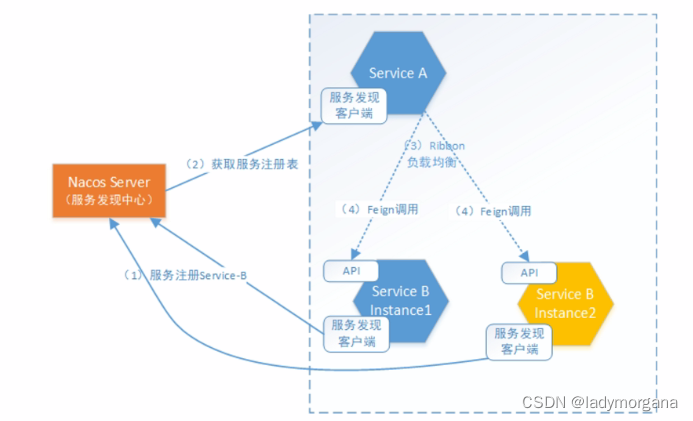 (1) 在微服务启动时,会向服务发现中心上报自身实例信息,这里ServiceB包含多个实例。