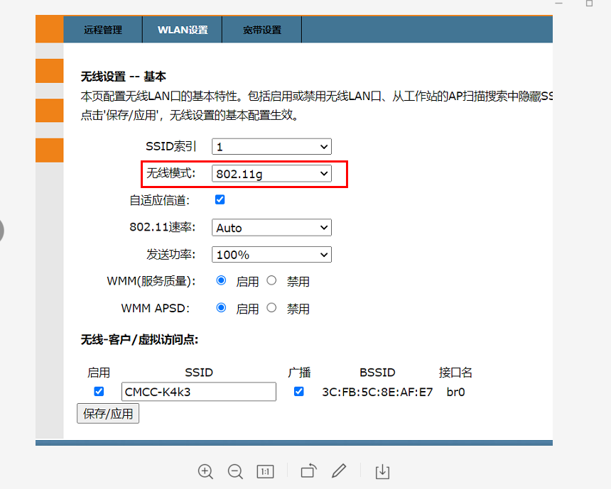 使用2.4g。需要修改成802.11n 或者(802.11g 下载速度慢)