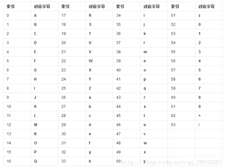 Base64,就是使用64个可打印字符来表示二进制数据的方法。Base64的索引与对应字符的关系如下表所示: