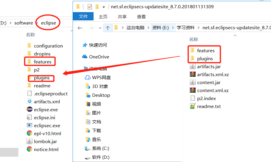- 复制 features 和 plugins 文件夹 到 eclipse 根目录下