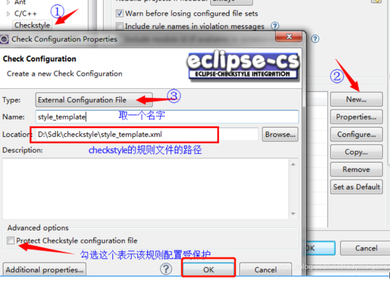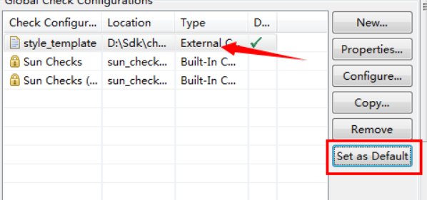 - Window -->Preferences,选择checkstyle菜单,增加项目组统一的规则文件,并设置为默认规则。如下图: