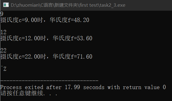 1 //task2_3 2 #include<stdio.h> 3 #include<math.h> 4 5 int main() 6 { 7 double c,f; 8 while(scanf("%lf",&c)!=EOF) 9 { 10 f=9*c/5+32; 11 printf("摄氏度c=%.2f时,华氏度f=%.2f\n",c,f); 12 printf("\n"); 13 } 14 15 return 0; 16 }