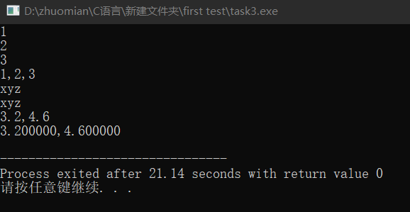//task3 #include<stdio.h> int main() { double x,y; char c1,c2,c3; int a1,a2,a3; scanf("%d%d%d",&a1,&a2,&a3);//添加& printf("%d,%d,%d\n",a1,a2,a3); getchar();//读取换行符 scanf("%c%c%c",&c1,&c2,&c3); printf("%c%c%c\n",c1,c2,c3); scanf("%lf,%lf",&x,&y);//%f改成%lf printf("%lf,%lf\n",x,y); return 0; }