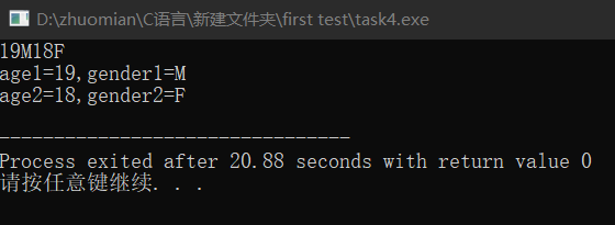 //task4 #include<stdio.h> int main() { int age1,age2; char gender1,gender2; scanf("%d%c%d%c",&age1,&gender1,&age2,&gender2); printf("age1=%d,gender1=%c\n",age1,gender1); printf("age2=%d,gender2=%c\n",age2,gender2); return 0; }