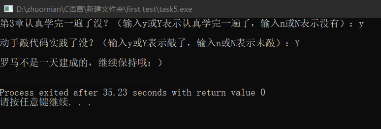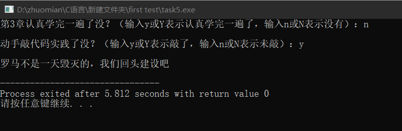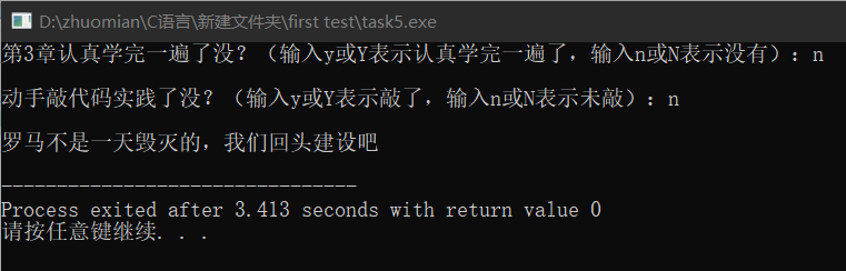 1 //task5 2 #include<stdio.h> 3 int main() 4 { 5 char ans1,ans2; 6 7 printf("第3章认真学完一遍了没?(输入y或Y表示认真学完一遍了,输入n或N表示没有):"); 8 ans1=getchar(); 9 getchar(); 10 printf("\n动手敲代码实践了没?(输入y或Y表示敲了,输入n或N表示未敲):") ; 11 ans2=getchar(); 12 13 if((ans1=='y'||ans1=='Y')&&(ans2=='y'||ans2=='Y')) 14 printf("\n罗马不是一天建成的,继续保持哦:)\n"); 15 else 16 printf("\n罗马不是一天毁灭的,我们回头建设吧\n"); 17 18 return 0; 19 }