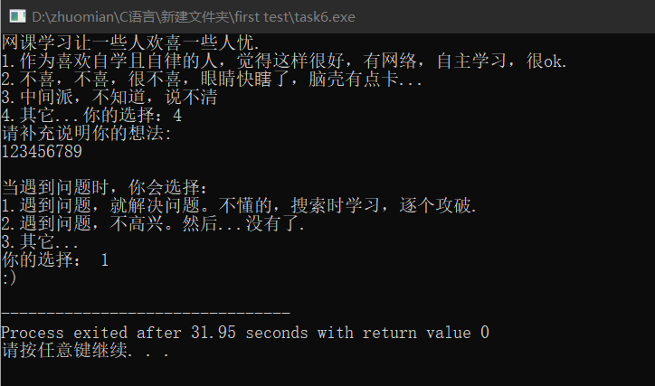 1 //task6 2 #include<stdio.h> 3 int main() 4 { 5 int answer; 6 char words[5000]; 7 printf("网课学习让一些人欢喜一些人忧.\n"); 8 printf("1.作为喜欢自学且自律的人,觉得这样很好,有网络,自主学习,很ok.\n"); 9 printf("2.不喜,不喜,很不喜,眼睛快瞎了,脑壳有点卡...\n"); 10 printf("3.中间派,不知道,说不清\n"); 11 printf("4.其它..."); 12 printf("你的选择:"); 13 scanf("%d",&answer); 14 15 if(answer==4) 16 { 17 printf("请补充说明你的想法:\n"); 18 getchar(); 19 gets(words); 20 } 21 22 printf("\n"); 23 24 printf("当遇到问题时,你会选择:\n"); 25 printf("1.遇到问题,就解决问题。不懂的,搜索时学习,逐个攻破.\n"); 26 printf("2.遇到问题,不高兴。然后...没有了.\n"); 27 printf("3.其它...\n"); 28 printf("你的选择: "); 29 scanf("%d",&answer); 30 if(answer==1) 31 printf(":)\n"); 32 else if(answer==2) 33 printf("这样不能解决问题啊...我们选择1好不好:)\n"); 34 else if(answer==3) 35 { 36 printf("请补充说明你的想法:\n"); 37 getchar(); 38 gets(words); 39 } 40 return 0; 41 }