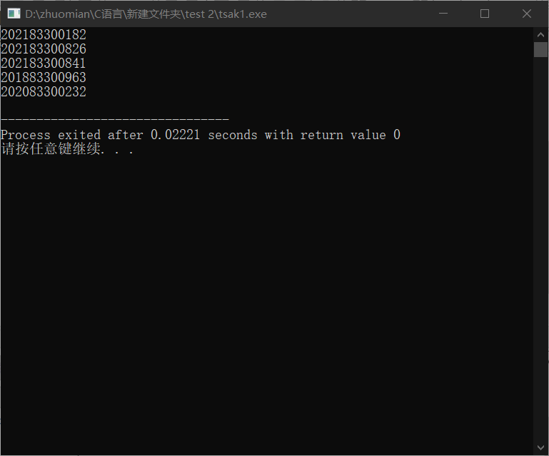 1 #include<stdio.h> 2 #include<stdlib.h> 3 #include<time.h> 4 5 #define N 5 6 7 int main() 8 { 9 int grade,number; 10 int i; 11 12 srand(time(0)); 13 14 for(i=0;i<N;++i) 15 { 16 grade=rand()%4+2018;//生成2018~2021之间的随机数 17 number=rand()%999+1;//生成1~999之间的随机数 18 printf("%d8330%04d\n",grade,number); 19 } 20 21 return 0; 22 }