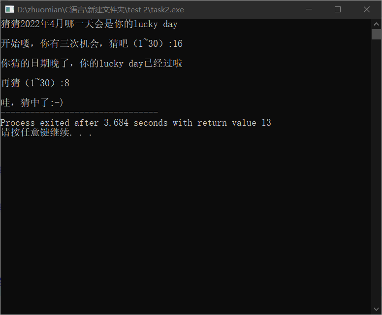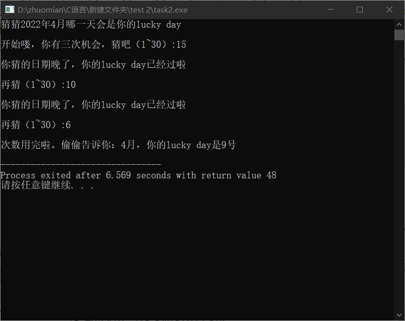 1 #include<stdio.h> 2 #include<stdlib.h> 3 4 #define N 3 5 6 int main() 7 { 8 int i,n,k; 9 srand(time(0)); 10 11 printf("猜猜2022年4月哪一天会是你的lucky day\n"); 12 k=rand()%29+1; 13 printf("\n开始喽,你有三次机会,猜吧(1~30):"); 14 15 for(i=1;i<=N;i++) 16 { 17 scanf("%d",&n); 18 printf("\n"); 19 if(i<N) 20 { 21 if(n<k) 22 { 23 printf("你猜的日期早了,你的lucky day还没到呢\n\n再猜(1~30):"); 24 } 25 else if(n>k) 26 { 27 printf("你猜的日期晚了,你的lucky day已经过啦\n\n再猜(1~30):"); 28 } 29 else if(n==k) 30 { 31 printf("哇,猜中了:-)"); 32 break; 33 } 34 } 35 else if(n!=k) printf("次数用完啦。偷偷告诉你:4月,你的lucky day是%d号\n",k); 36 else if(n==k) printf("哇,猜中了:-)"); 37 } 38 return 0; 39 }