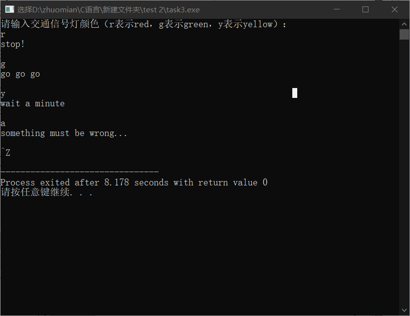 1 #include<stdio.h> 2 3 int main() 4 { 5 char a; 6 printf("请输入交通信号灯颜色(r表示red,g表示green,y表示yellow):\n"); 7 while(scanf("%s",&a)!=EOF) 8 { 9 switch(a) 10 { 11 case 'r':printf("stop!\n\n");break; 12 case 'g':printf("go go go\n\n");break; 13 case 'y':printf("wait a minute\n\n");break; 14 default:printf("something must be wrong...\n\n"); 15 } 16 } 17 return 0; 18 }