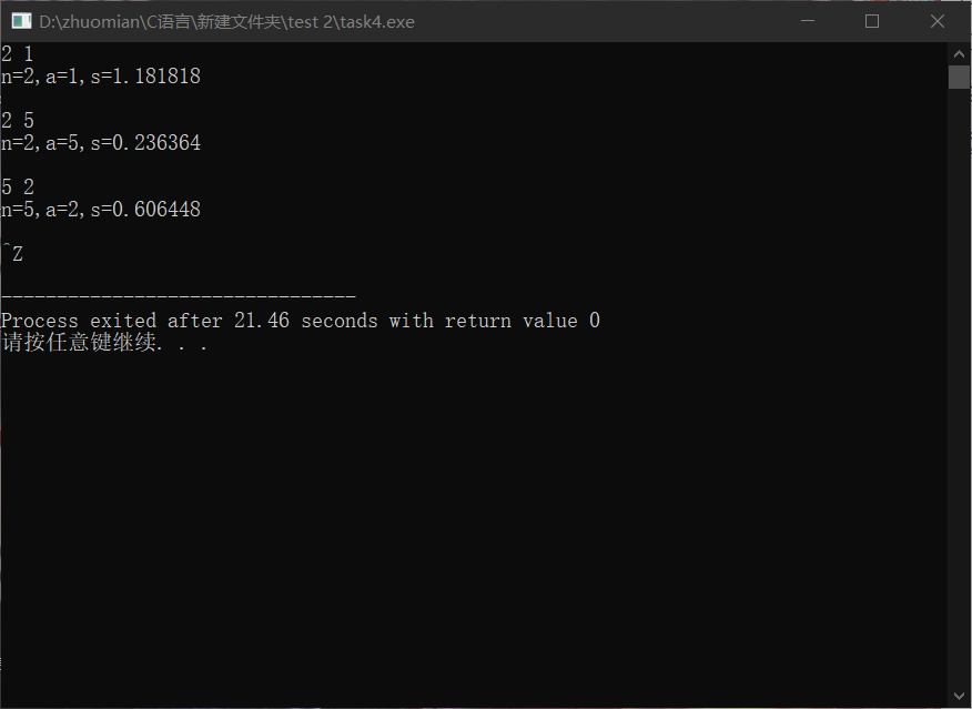 1 #include<stdio.h> 2 #include<math.h> 3 4 int main() 5 { 6 int i,n,a,k;double s; 7 while(scanf("%d%d",&n,&a)!=EOF) 8 { 9 k=0;s=0; 10 for(i=1;i<=n;i++) 11 { 12 k=k*10+a; 13 s+=1.0*i/k; 14 } 15 printf("n=%d,a=%d,s=%f\n\n",n,a,s); 16 } 17 return 0; 18 }