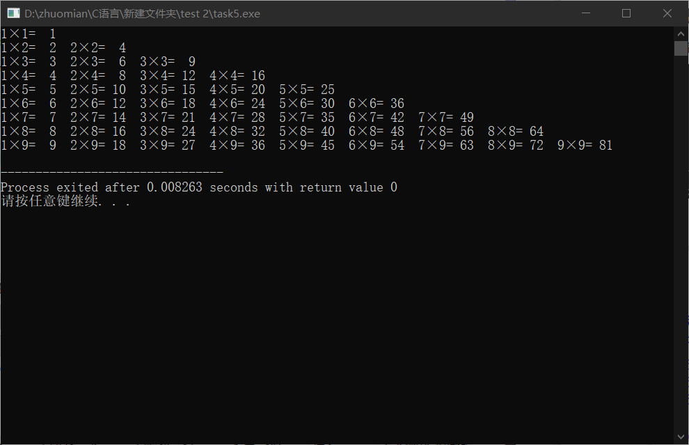 #include<stdio.h> #define N 9 int main() { int i,j; for(i=1;i<=N;i++) { for(j=1;j<=i;j++) { printf("%d×%d= %2d ",j,i,i*j); } printf("\n"); } return 0; }