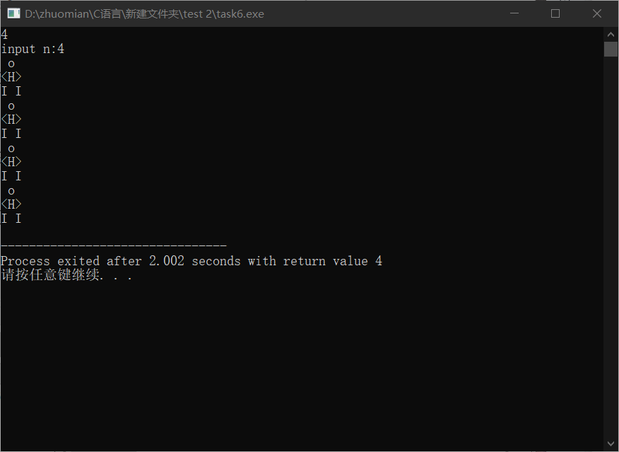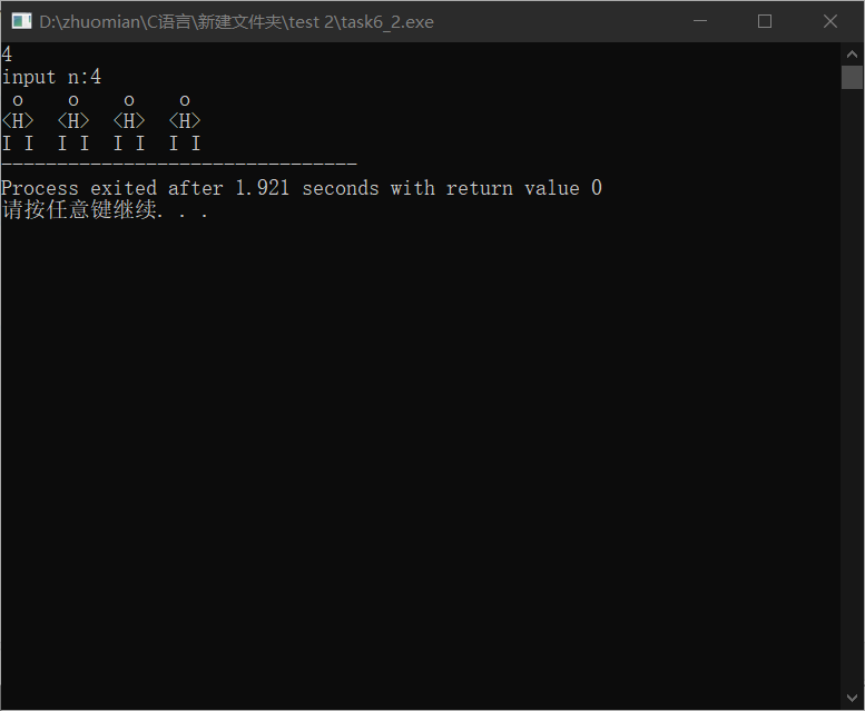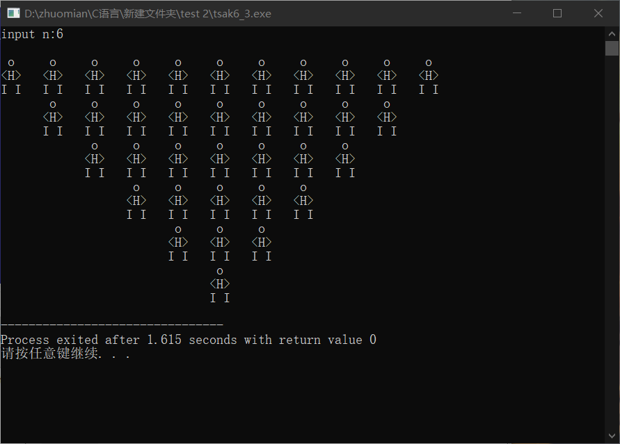 1 #include<stdio.h> 2 3 int main() 4 { 5 int i,j,n; 6 printf("input n:"); 7 scanf("%d",&n); 8 printf("\n"); 9 10 for(i=1;i<=n;i++) 11 { 12 for(j=1;j<i;j++) 13 { 14 printf(" "); 15 } 16 for(j=1;j<=2*(n+1-i)-1;j++) 17 { 18 printf(" o "); 19 } 20 printf("\n"); 21 22 for(j=1;j<i;j++) 23 { 24 printf(" "); 25 } 26 for(j=1;j<=2*(n+1-i)-1;j++) 27 { 28 printf("<H> "); 29 } 30 printf("\n"); 31 32 for(j=1;j<i;j++) 33 { 34 printf(" "); 35 } 36 for(j=1;j<=2*(n+1-i)-1;j++) 37 { 38 printf("I I "); 39 } 40 printf("\n"); 41 } 42 return 0; 43 }