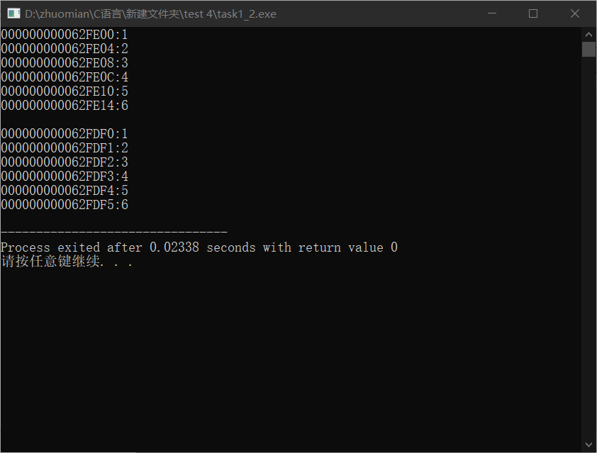 1 #include<stdio.h> 2 #define N 2 3 #define M 3 4 5 int main() 6 { 7 int a[N][M]={{1,2,3},{4,5,6}}; 8 char b[N][M]={{'1','2','3'},{'4','5','6'}}; 9 int i,j; 10 11 for(i=0;i<N;++i) 12 for(j=0;j<M;++j) 13 printf("%p:%d\n",&a[i][j],a[i][j]); 14 15 printf("\n"); 16 17 for(i=0;i<N;++i) 18 for(j=0;j<M;++j) 19 printf("%p:%c\n",&b[i][j],b[i][j]); 20 21 return 0; 22 }