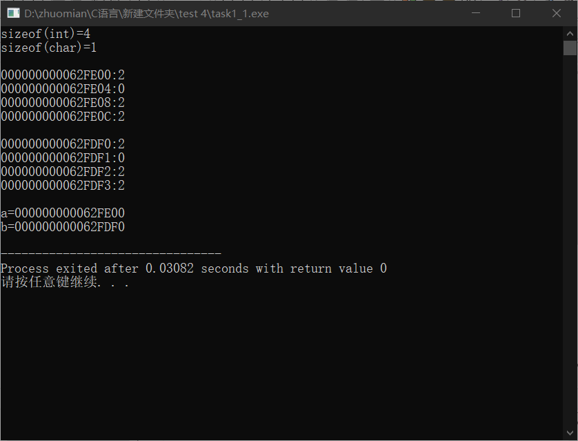 1 #include<stdio.h> 2 #define N 4 3 4 int main() 5 { 6 int a[N]={2,0,2,2}; 7 char b[N]={'2','0','2','2'}; 8 int i; 9 10 printf("sizeof(int)=%d\n",sizeof(int)); 11 printf("sizeof(char)=%d\n",sizeof(char)); 12 printf("\n"); 13 14 for(i=0;i<N;++i) 15 { 16 printf("%p:%d\n",&a[i],a[i]); 17 } 18 19 printf("\n"); 20 21 for(i=0;i<N;++i) 22 { 23 printf("%p:%c\n",&b[i],b[i]); 24 } 25 26 printf("\n"); 27 28 printf("a=%p\n",a); 29 printf("b=%p\n",b); 30 31 return 0; 32 }