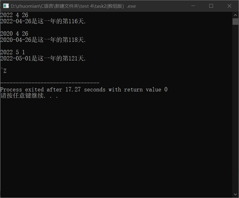 1 #include<stdio.h> 2 3 int days_of_year(int year,int month,int day); 4 5 int main() 6 { 7 int year,month,day;int days; 8 9 while(scanf("%d%d%d",&year,&month,&day)!=EOF) 10 { 11 days=days_of_year(year,month,day); 12 printf("%4d-%02d-%02d是这一年的第%d天.\n\n",year,month,day,days); 13 } 14 15 return 0; 16 } 17 18 int days_of_year(int year,int month,int day) 19 { 20 int i,days=0; 21 int mon[12]={0,31,28,31,30,31,30,31,31,30,31,30}; 22 for(i=1;i<month;i++) 23 { 24 if((year%4==0)&&(year%100!=0)||year%400==0) 25 { 26 mon[2]++; 27 } 28 days+=mon[i]; 29 } 30 days+=day; 31 return days; 32 }