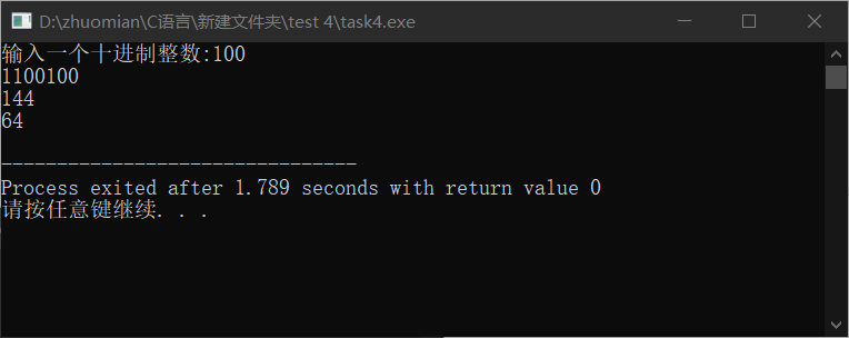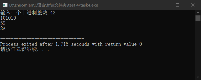 1 #include<stdio.h> 2 3 void dec2n(int x,int n); 4 5 int main() 6 { 7 int x; 8 9 printf("输入一个十进制整数:"); 10 scanf("%d",&x); 11 12 dec2n(x,2); 13 printf("\n"); 14 dec2n(x,8); 15 printf("\n"); 16 dec2n(x,16); 17 printf("\n"); 18 19 return 0; 20 } 21 22 void dec2n(int x,int n) 23 { 24 int a,b;char m[16]={"0123456789ABCDEF"}; 25 a=x/n; 26 b=x%n; 27 if(a==0) 28 { 29 printf("%c",m[b]); 30 } 31 else 32 { 33 dec2n(a,n); 34 printf("%c",m[b]); 35 } 36 }