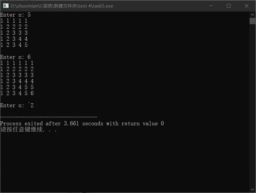1 #include<stdio.h> 2 3 void ulmatrix(int n); 4 5 int main() 6 { 7 int n;int a[n][n]; 8 printf("Enter n: "); 9 while(scanf("%d",&n)!=EOF) 10 { 11 ulmatrix(n); 12 printf("\nEnter n: "); 13 } 14 15 return 0; 16 } 17 18 void ulmatrix(int n) 19 { 20 int i,j,a[n][n]; 21 for(i=0;i<n;i++) 22 { 23 for(j=0;j<n;j++) 24 { 25 if(i<=j) 26 { 27 a[i][j]=i+1; 28 } 29 else 30 { 31 a[i][j]=j+1; 32 } 33 printf("%d ",a[i][j]); 34 } 35 printf("\n"); 36 } 37 }