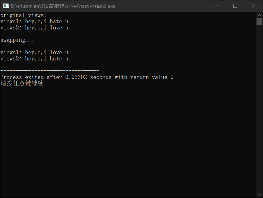1 #include<stdio.h> 2 #define N 80 3 4 int main() 5 { 6 char views1[N]="hey,c,i hate u."; 7 char views2[N]="hey,c,i love u."; 8 char view[N];int i=0; 9 10 printf("original views:\n"); 11 printf("views1: %s\n",views1); 12 printf("views2: %s\n",views2); 13 14 for(i=0;i<N;i++) 15 { 16 view[i]=views1[i]; 17 views1[i]=views2[i]; 18 views2[i]=view[i]; 19 } 20 21 printf("\nswapping...\n\n"); 22 printf("views1: %s\n",views1); 23 printf("views2: %s\n",views2); 24 25 return 0; 26 }