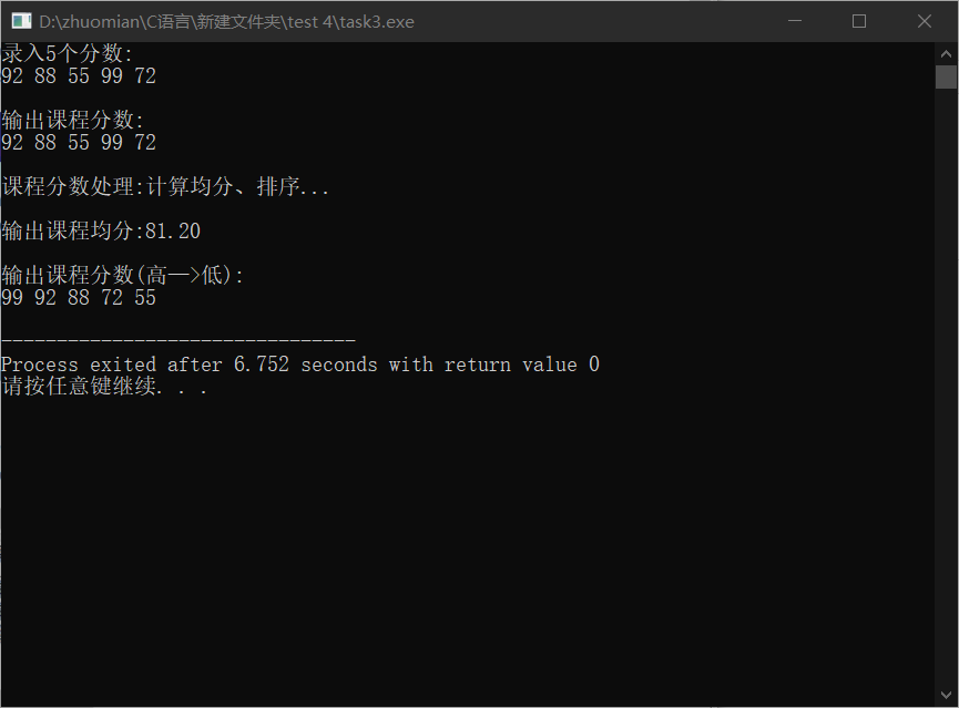 1 #include<stdio.h> 2 #define N 5 3 4 void input(int x[],int n); 5 void output(int x[],int n); 6 double average(int x[],int n); 7 void sort(int x[],int n); 8 9 int main() 10 { 11 int scores[N]; 12 double ave; 13 14 printf("录入%d个分数:\n",N); 15 input(scores,N); 16 17 printf("\n输出课程分数:\n"); 18 output(scores,N); 19 20 printf("\n课程分数处理:计算均分、排序...\n"); 21 ave=average(scores,N); 22 sort(scores,N); 23 24 printf("\n输出课程均分:%.2f\n",ave); 25 printf("\n输出课程分数(高—>低):\n"); 26 output(scores,N); 27 28 return 0; 29 } 30 31 void input(int x[],int n) 32 { 33 int i; 34 for(i=0;i<n;++i) 35 scanf("%d",&x[i]); 36 } 37 38 void output(int x[],int n) 39 { 40 int i; 41 for(i=0;i<n;++i) 42 printf("%d ",x[i]); 43 44 printf("\n"); 45 } 46 47 double average(int x[],int n) 48 { 49 int sum=0,i;double s; 50 for(i=0;i<n;++i) 51 { 52 sum+=x[i]; 53 } 54 s=1.0*sum/n; 55 return s; 56 } 57 58 void sort(int x[],int n) 59 { 60 int i,j,k; 61 for(i=0;i<n;++i) 62 { 63 for(j=0;j<i;j++) 64 { 65 if(x[i]>x[j]) 66 { 67 k=x[i]; 68 x[i]=x[j]; 69 x[j]=k; 70 } 71 } 72 } 73 }
