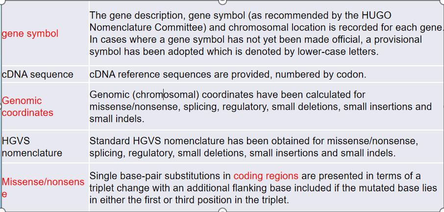 HGMD收集的数据包括了单碱基置换、微缺失(micro-deletions)和 微插入(micro-insertions) 、缺失/插入(indels) 、重复序列扩增以及大的基因损伤(缺失、插入和培增)和复杂的基因重组。