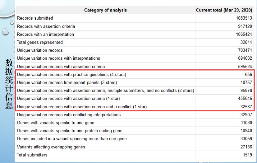 ClinVar是一个应用较广泛的数据库,整合遗传变异和临床表型方面分散的数据,将变异、临床表型、实证数据以及功能注解与分析等四个方面的信息,通过专家评审,逐步形成一个标准的、可信的、稳定的遗传变异-临床表型相关的数据库。