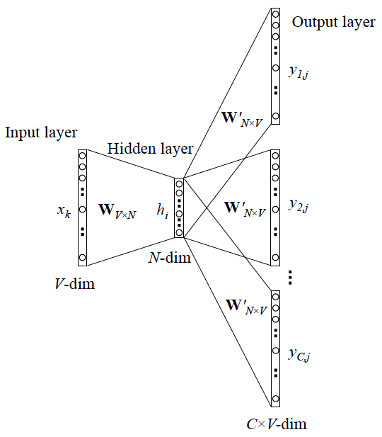 - 嵌入过程的假设:最大化上述目标会得到良好的嵌入效果\(v_w \forall w\in V\),也就是说相似的词会有相似的向量。(用分级hierarchical softmax替换softmax减少计算量)
