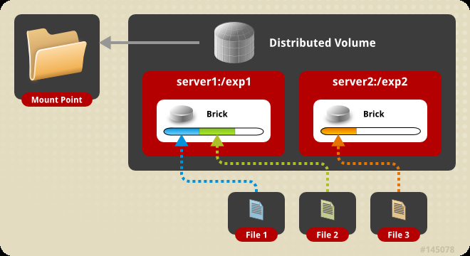 分布卷:在分布式卷中,文件随机扩展到卷中的砖块中。使用分布式卷,需要扩展存储和冗余不是很重要,或由其他硬件/软件层提供。可以在线扩容,在多个brick中随机存储
