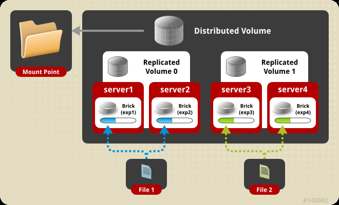 注:4台机器分两个复制组,每组两台,组内默认分布式。经过测试:9.0版本后和复制卷Replicated效果相同