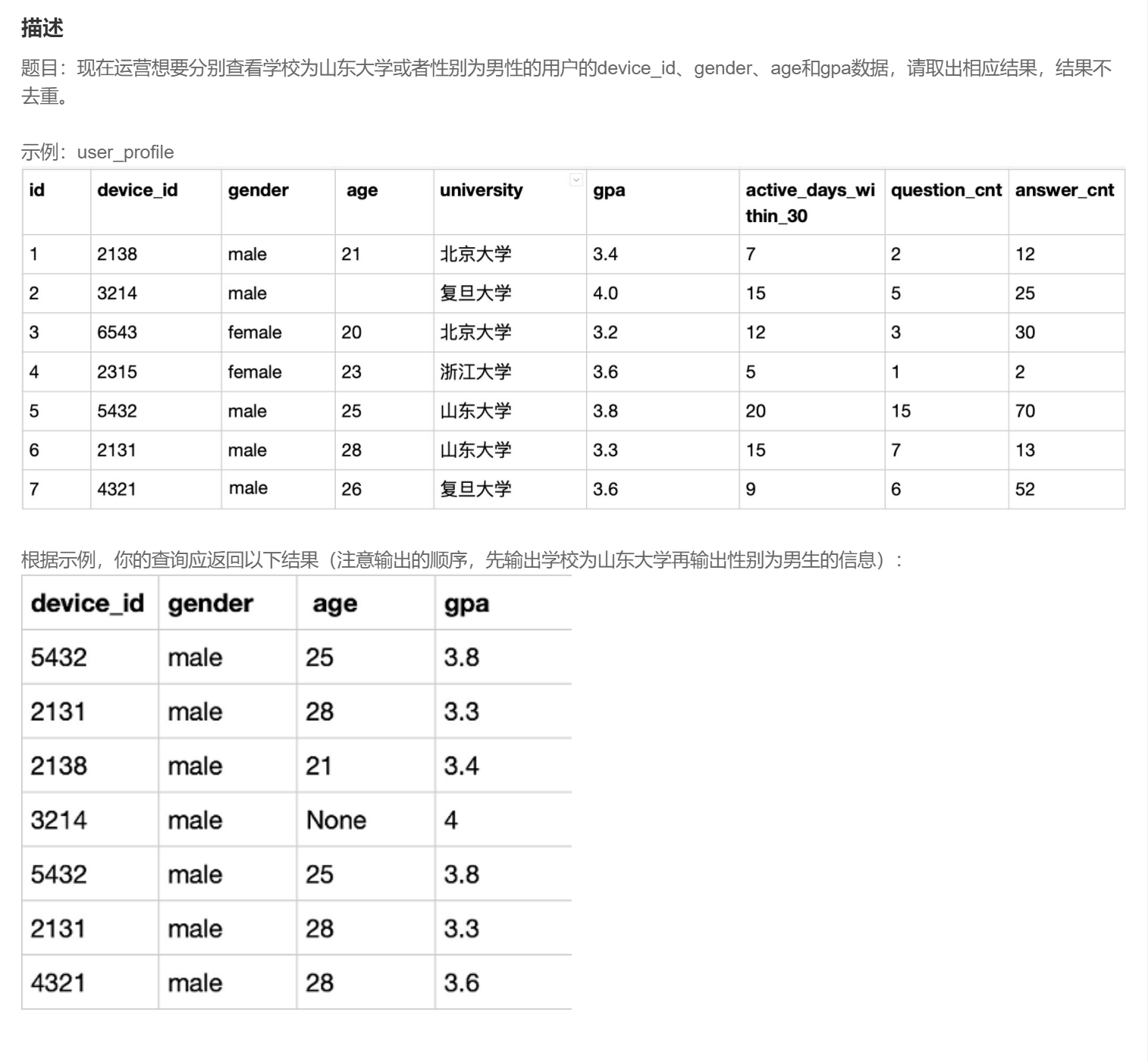 select device_id,gender,age,gpa from user_profile WHERE university = '山东大学' UNION ALL select device_id,gender,age,gpa from user_profile WHERE gender = 'male'