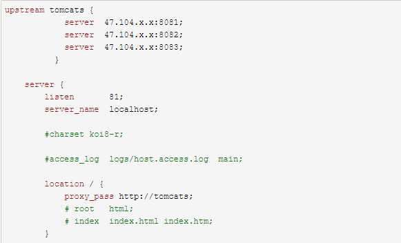 在server上方加个upstream标签,把多个服务器server地址配置进去就可以了