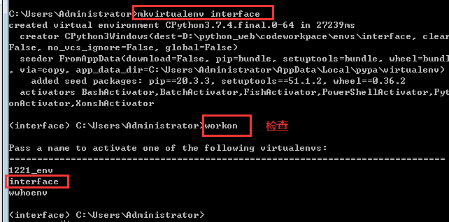 新建好虚拟环境,使用workon命令进行检查,是否安装好了