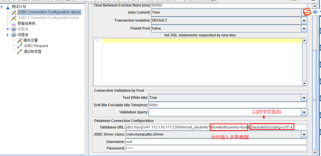 ?allowMultiQueries=true&characterEncoding=UTF-8 一个是用来大量数据操作,一个是设置字符集格式为:UTF-8