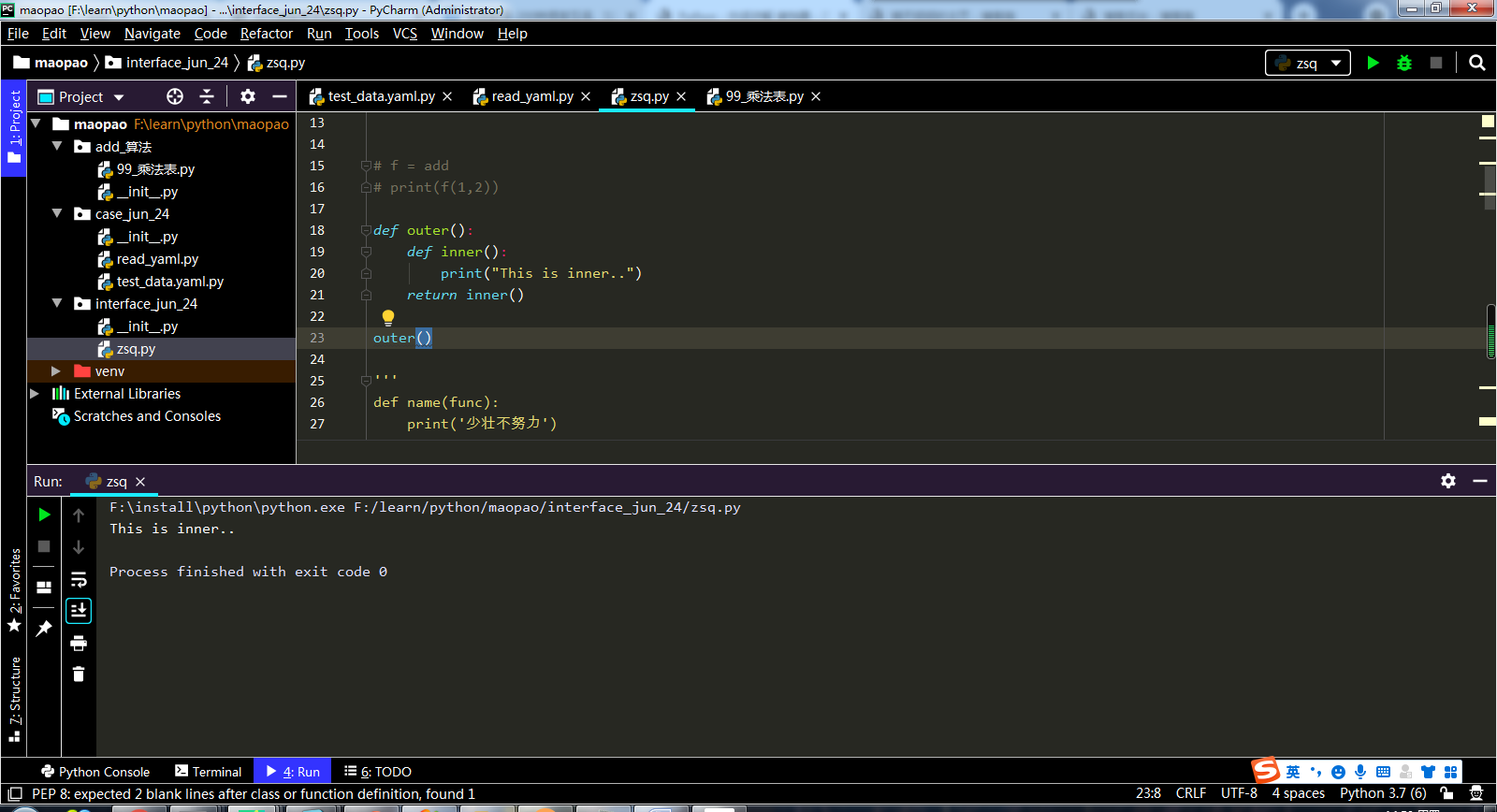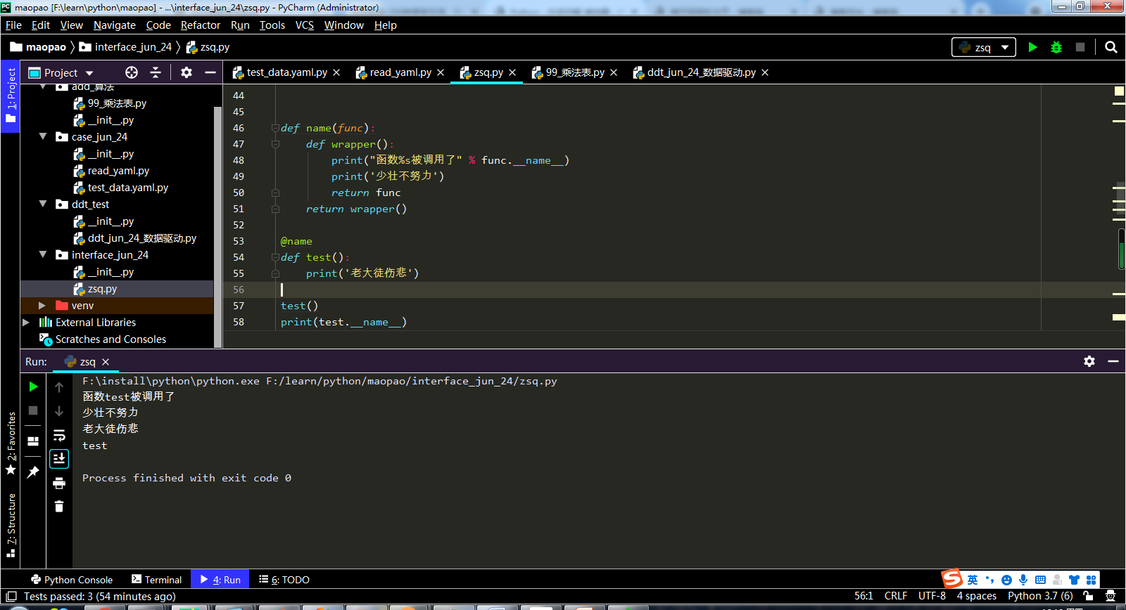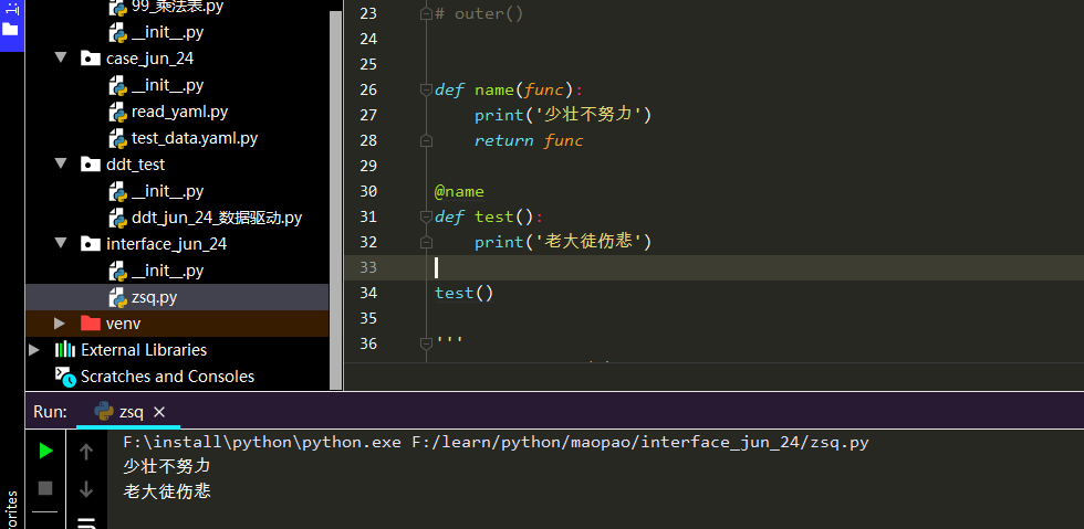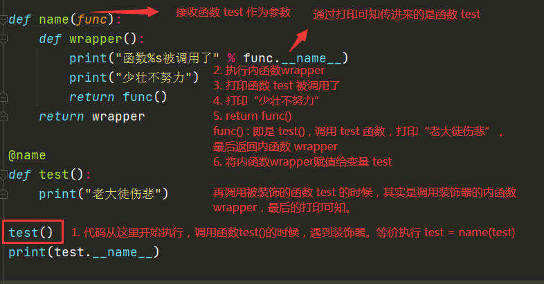 想要实现一个功能,在不改变 test 函数内部结构的前提下,在前面加一句 “少壮不努力”