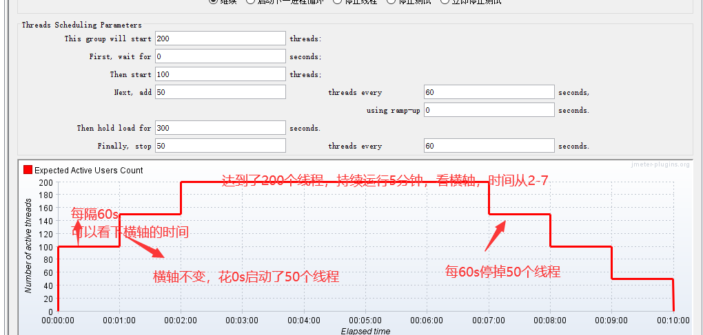 l Next add N1 threads every N2 seconds, using ramp-up N3 seconds - 这个不好理解。表示在N3s内启动N1个线程,每隔N2s.。太拗口,就看图上的配置,每隔60s,花0s的时间启动50个线程